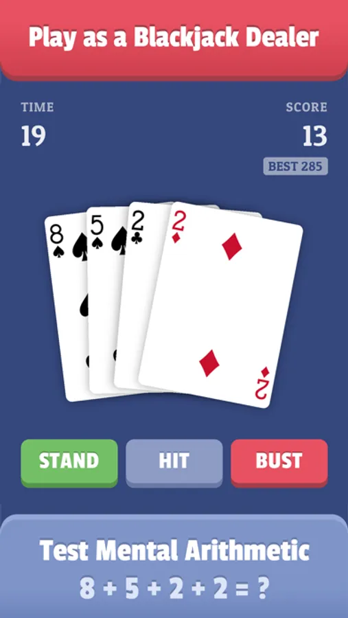 Blackjack Speed Math is an addictive game challenging your mental arithmetic skill while you play as a Blackjack dealer.