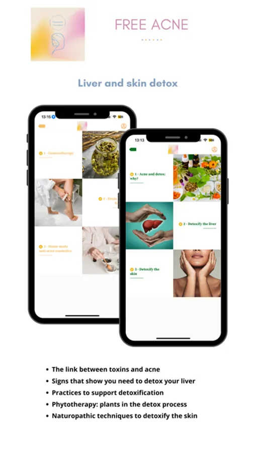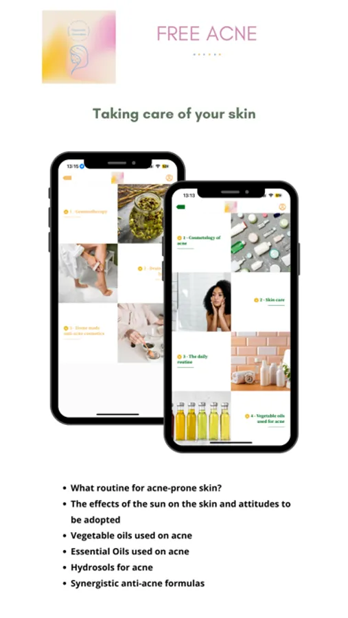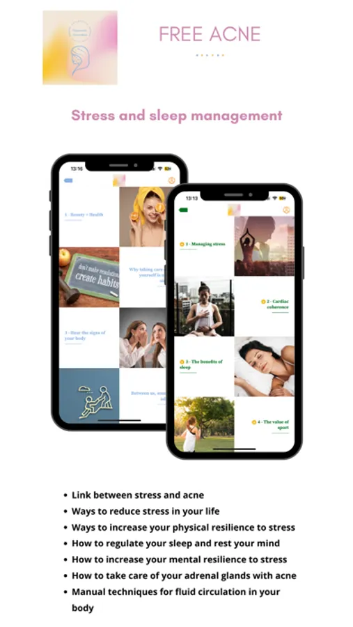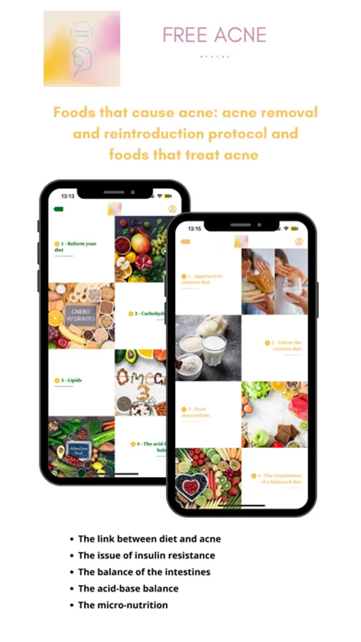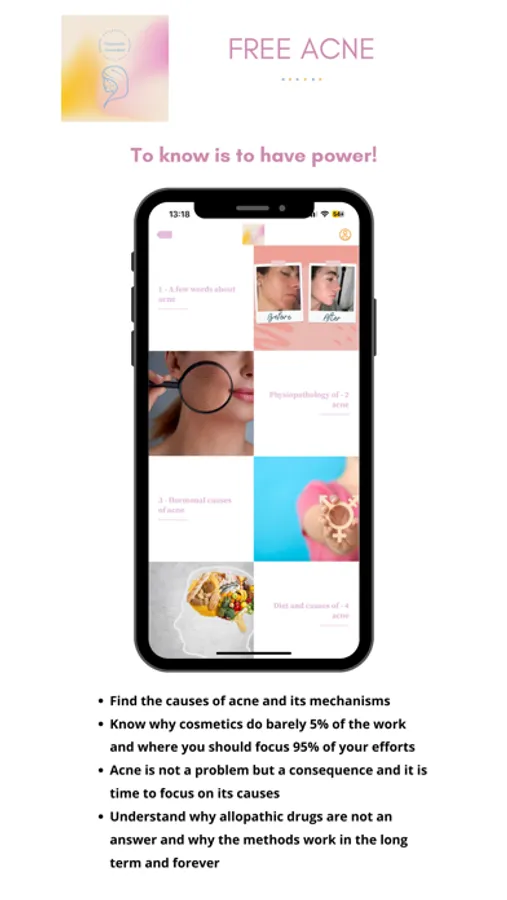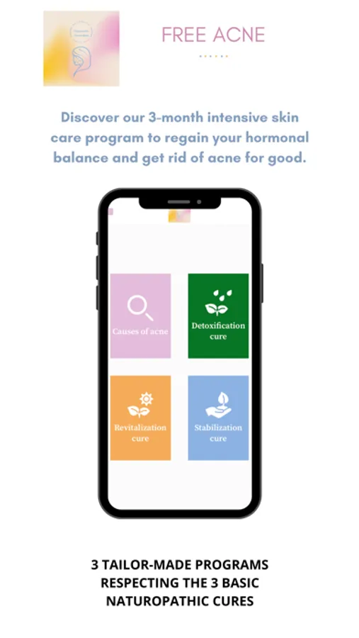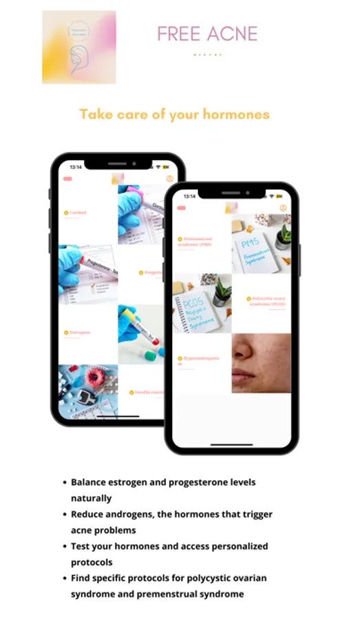 In this program, you will discover a special "hormones" section to test and understand their role in acne. Protocols are proposed to regulate what Mother Nature has put at your disposal. This application's objective and ambition is to accompany you and help you get rid of your acne for good.