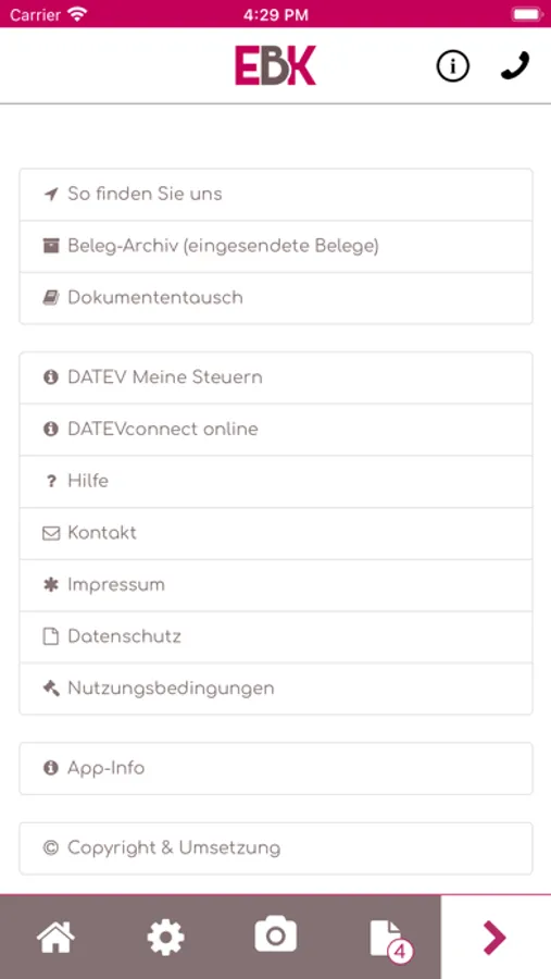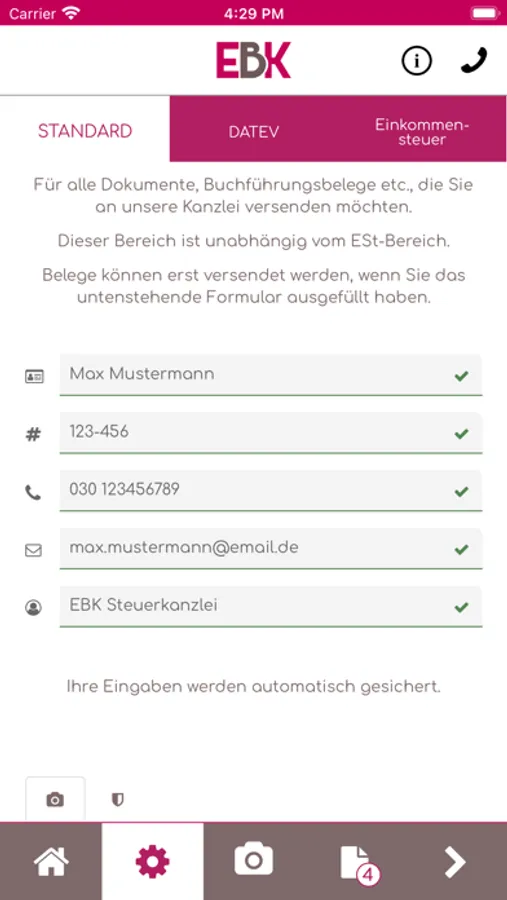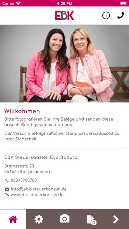 Mithilfe dieser App können Sie Belege, Dokumente und andere Schriftstücke schnell, sicher und komfortabel an EBK Steuerkanzlei, Eva Bodura gesendet werden.
