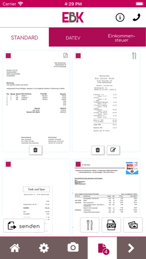 Machen Sie einfach ein oder mehrere Fotos von Ihren Belegen und versenden Sie diese mit einem Klick direkt aus der App heraus an EBK Steuerkanzlei, Eva Bodura