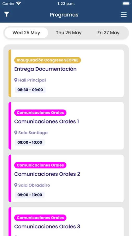 - Consultar todo el programa actualizado en tiempo real, organizado por fecha, hora y modalidad