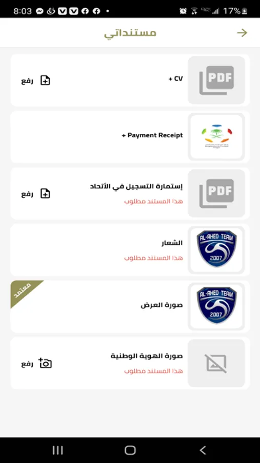 Membership registration, documents uploading - team system request - indicators panel.