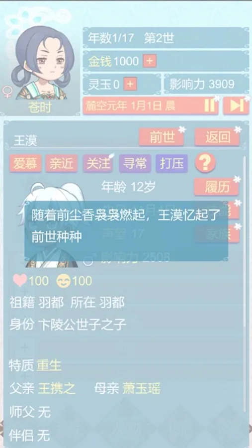 *在本作里,每个用户第一世会遇到的事情都不一样,您所遇到的某个人可能在别人的世界有着毫不相同的人生,而后续的所有轮回都会以第一世发生的事情为蓝本进行