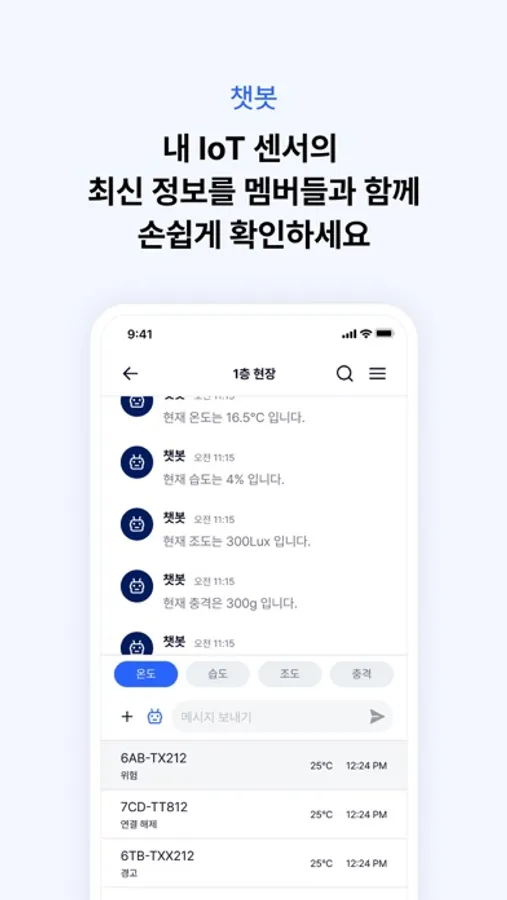 챗봇 기능을 이용해서 내 IoT 센서의 최신 정보를 멤버들과 함께 손쉽게 확인할 수 있습니다.