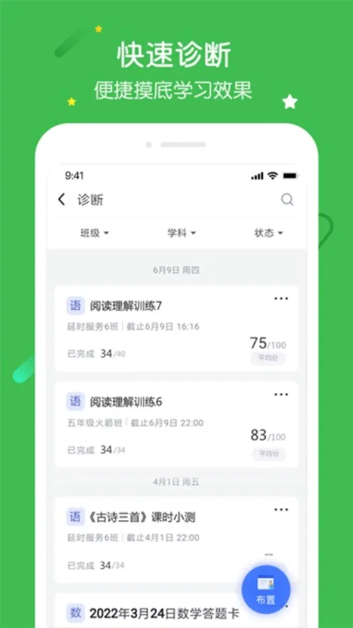 2、诊断:教师可基于答题卡发布测验任务,学生按题卡逐题反馈作答详情,即时获取班级诊断报告;