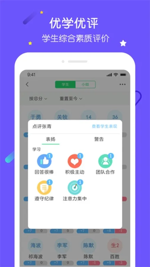 4、优学优评:教师可对学生的课中、课外的综合表现进行过程性全方位量化点评。