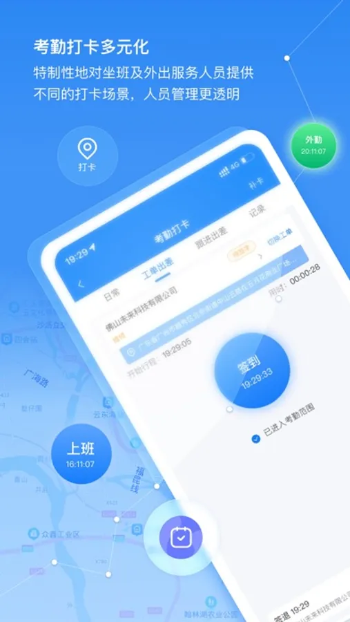 特制性地对日常坐班人员、销售人员、服务人员提供不同的打卡场景,人员管理更透明;