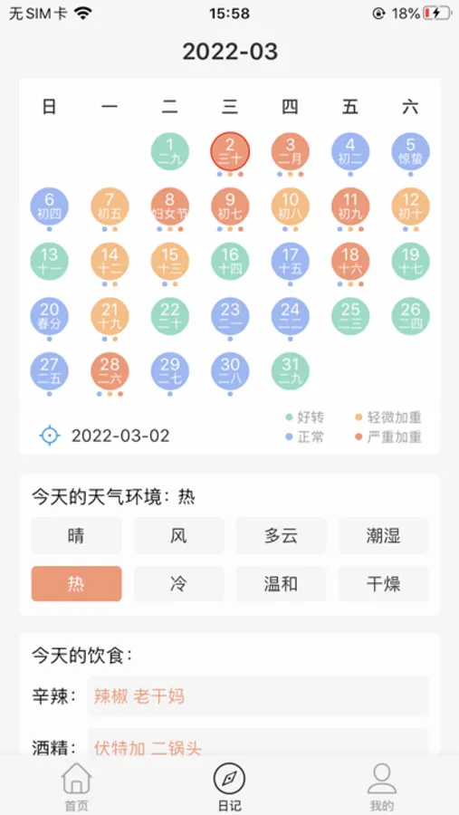 过敏克星同样提供了玫瑰日记功能,方便您每天记录自己的状况。过敏克星通过不同的颜色区分症状的加重与否,协助您准确的找出应该避讳的食品和化妆品。