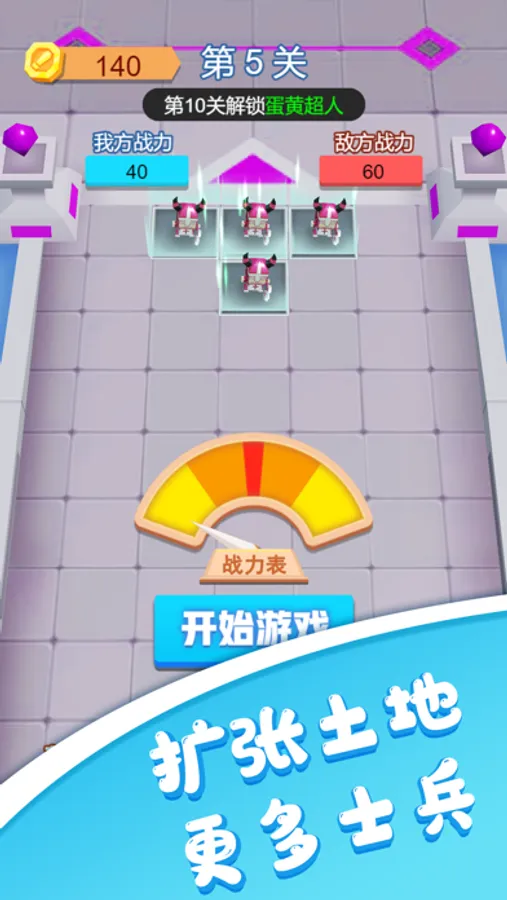每参加一场战斗都能获得金币,金币可以开拓土地和购买士兵,提升士兵的数量和战力,下一局就可以获得更多的金币。慢慢你就拥有庞大的士兵军团了。