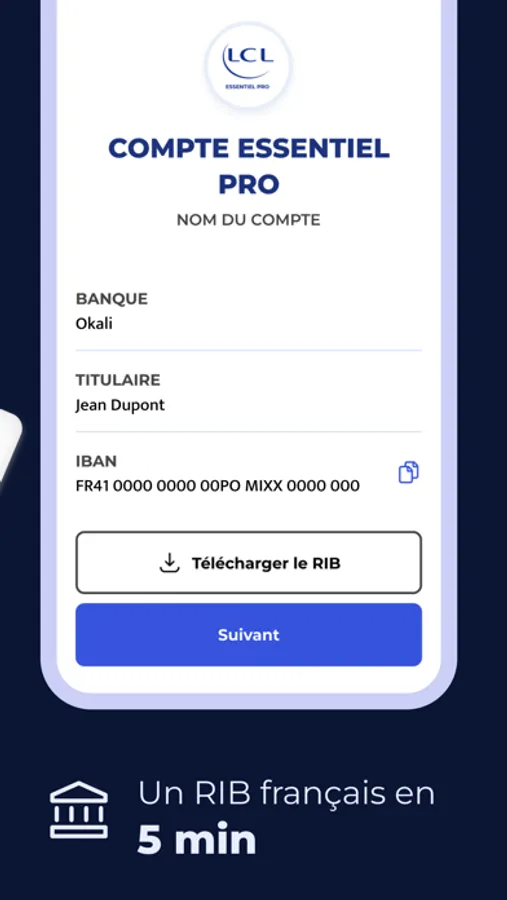 (1) L’offre Essentiel Pro est présentée par LCL et souscrite auprès d’Okali, filiale du même groupe auquel appartient LCL, établissement de monnaie électronique enregistré à l’ACPR sous le numéro 17 448 (https://www.regafi.fr), SAS, capital social : 4.660.962,00 euros, siège social : 50 rue la Boétie, 75008 Paris, RCS Paris 890 111 776.