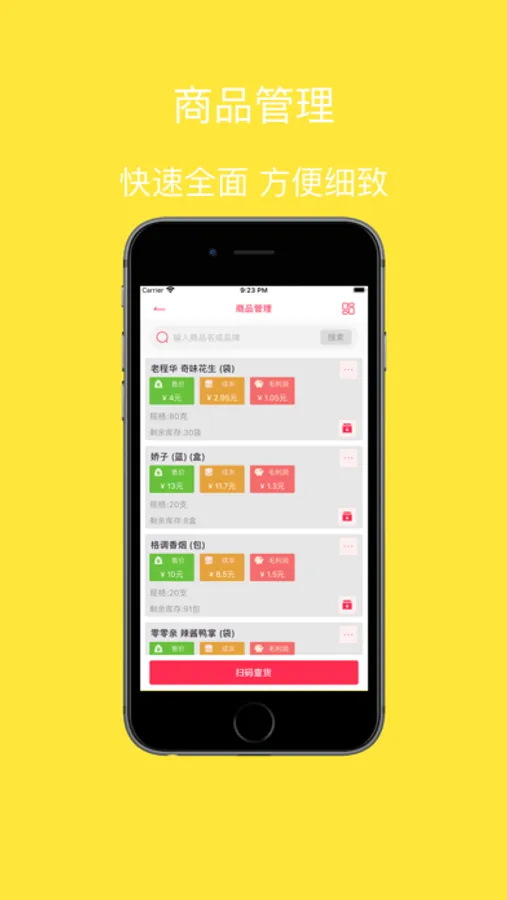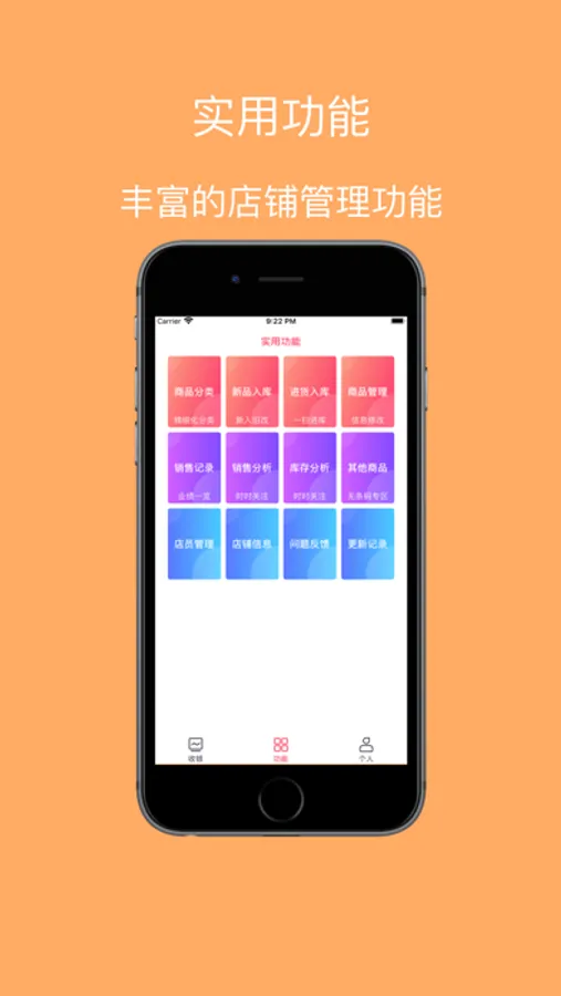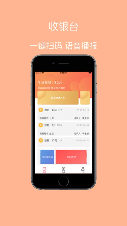 1. 便捷的移动收银,通过手机扫描条形码即可快速收银。从此告别臃肿的收银机!