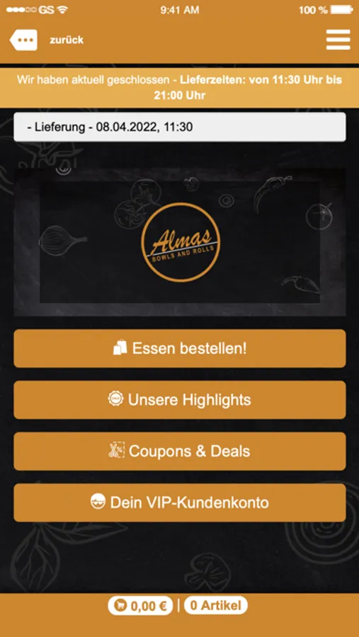 Almas Bowls and Rolls heißt Sie Willkommen in seiner App.