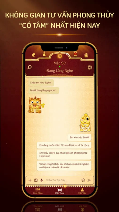Là ứng dụng Chat tư vấn lắng nghe tâm tư nguyện vọng của bạn qua đối thoại một cách chuyên nghiệp duy nhất hiện tại - cùng giao diện hoa văn bản sắc Việt tinh tế trang nghiêm.