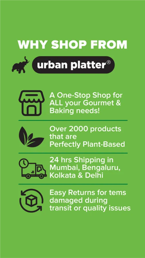 Introducing the Urban Platter Online Shopping App – The one-stop-shop for all your Vegan, Gourmet and Exotic Grocery needs. Shop from over 2,000 exciting products, including everything from Vegan Dairy & Meat Alternatives, Authentic exotic cooking ingredients from around the world and Exclusive Gourmet foods to level up your recipes. Take advantage of special discounts, priority shipping, easy returns, helpful customer service & secure payments.