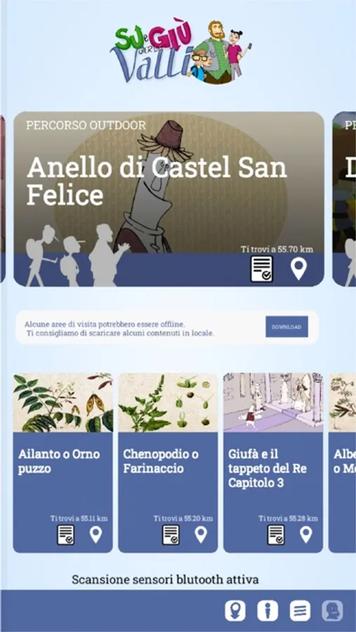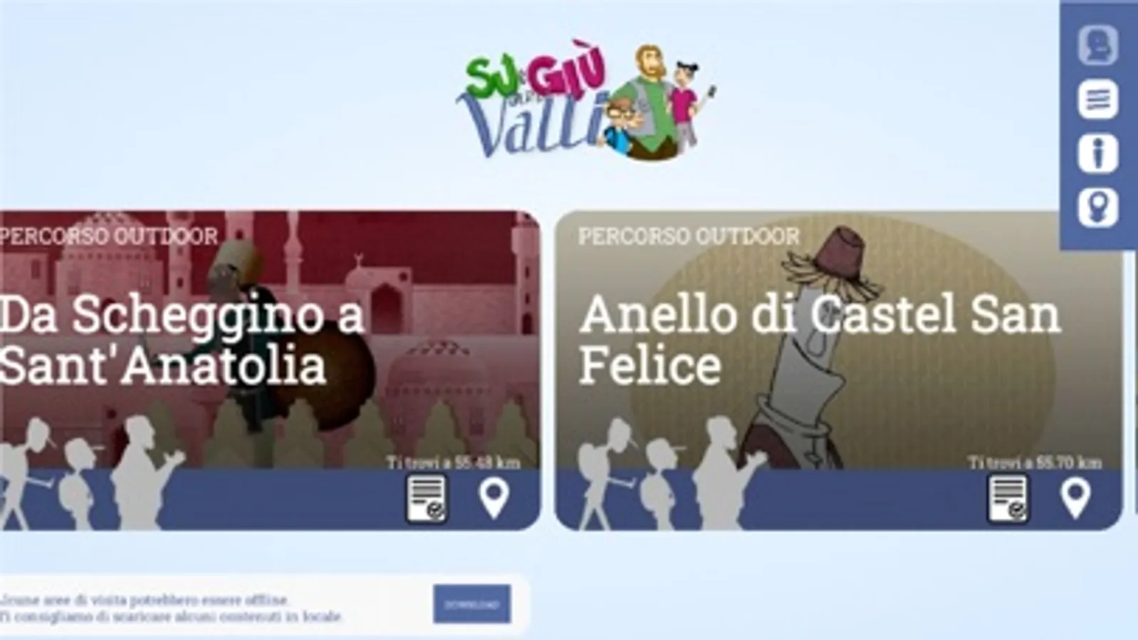 Su e giù per le valli è un app per escursioni guidate nel territorio di Sant’Anatolia di Narco, Scheggino e Gavelli. Attraverso miti e leggende della zona potrete visitare le valli, i monti e i borghi della Valnerina, accompagnati dalla voce Narrante di uno zio, impegnato in una escursione con i suoi 2 nipotini.