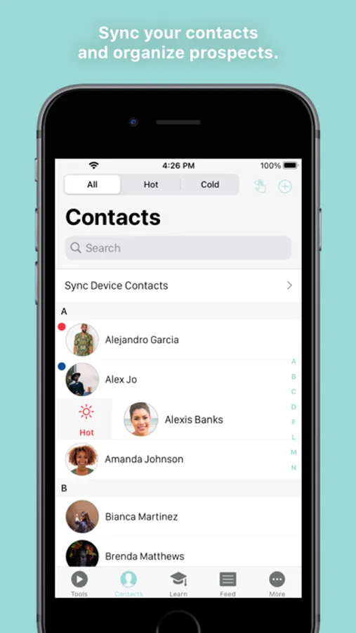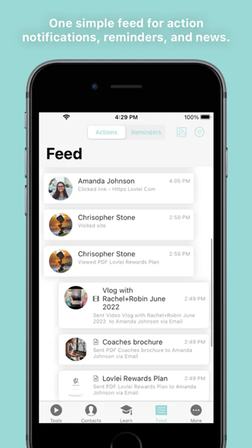 Contacts: Choose how to sync and manage your contacts. Swipe to sort them by interest level. You can make connections, add notes, or check out the Contact Feed to see the tools you’ve shared and contact actions.