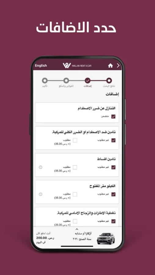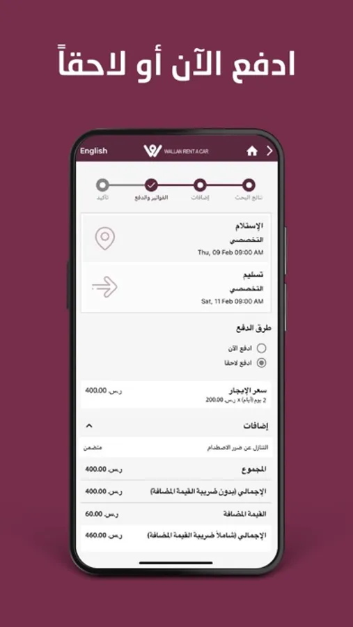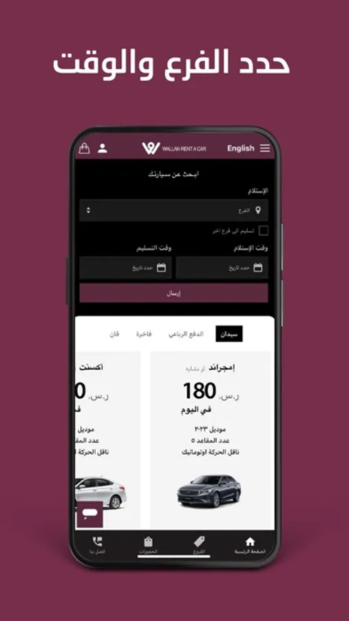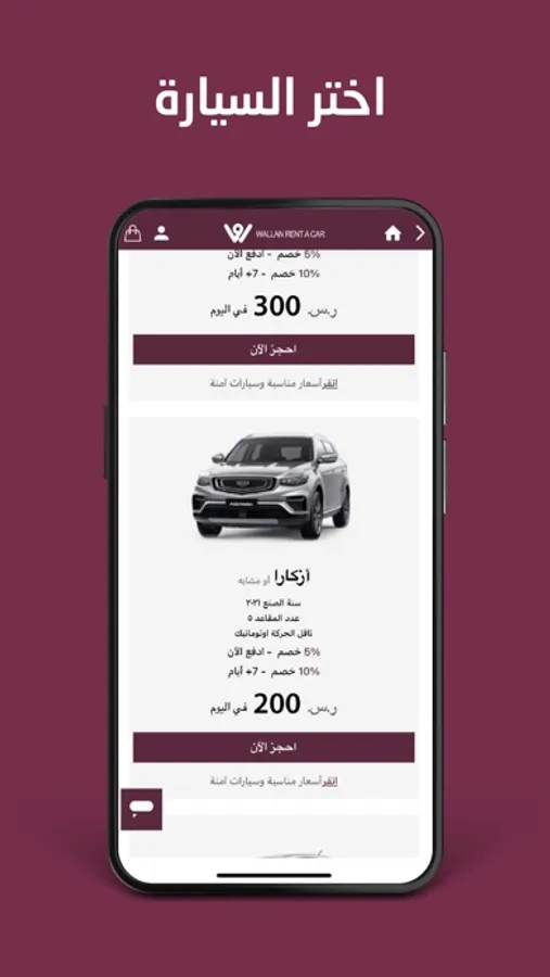 Wallan Rent-a-Car is a trusted company that serves major cities across the kingdom with a large and modern fleet of cars. The company focuses on offering the best car rental solution to address the transportation needs of our valued clients and is distinguished by its extensive branch network, large fleet to meet the customers' needs, competitive rates and special promos, and professional and qualified team. With our app, you can easily select the car model you want, reserve it, and see the prices and features.