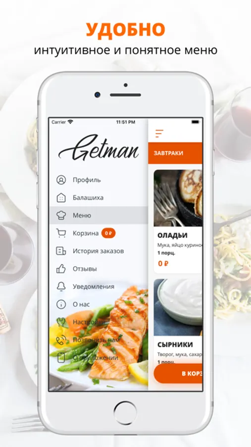 Приложение GETMAN — это удобный способ заказа еды домой или в офис! Мы готовим наши блюда из качественных свежих ингредиентов и доставляем еду быстро и бережно.