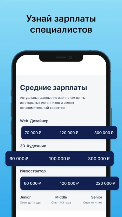 Мы с радостью поможем вам сориентироваться в последних тенденциях на рынке труда и расскажем все о самых востребованных профессиях мира. Прямо на странице интересующего вас курса вы увидите, какие зарплаты получают специалисты на разных должностях: от Junior до Team Lead.