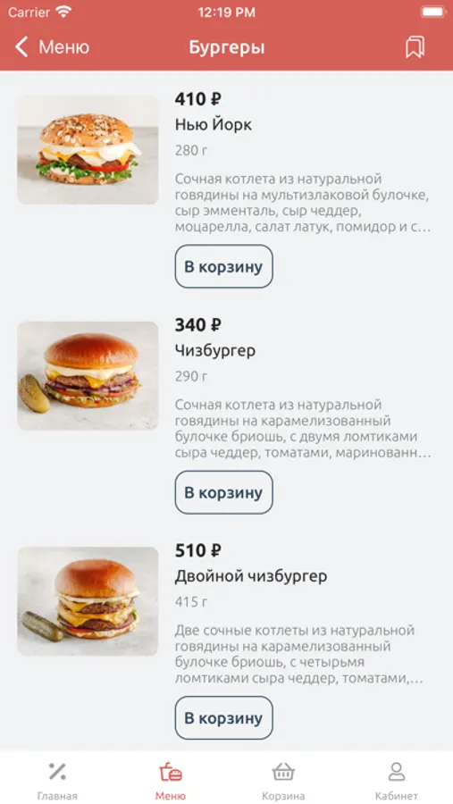 • бургеры с сочной, 100% мясной котлетой;