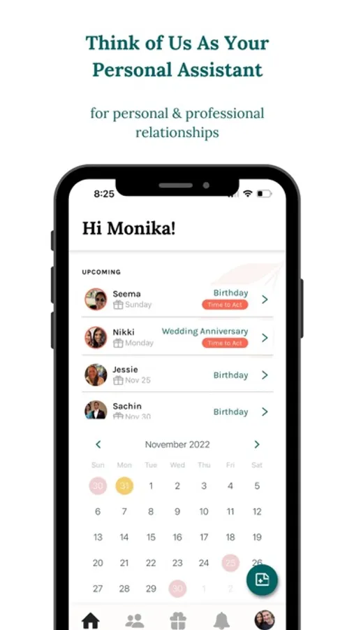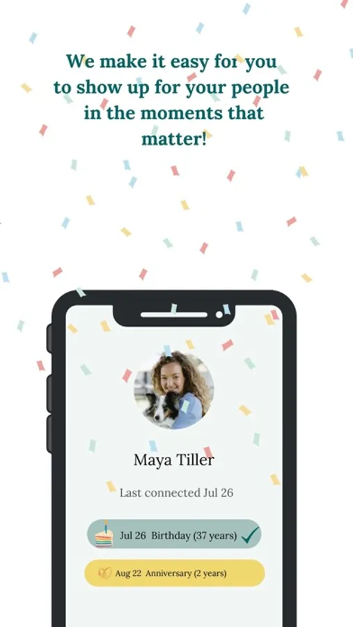 Present makes it easy to remember and celebrate birthdays & all special occasions. We'll pull all your information into one easy-to-reference spot, nudge you when it's time to take action, and then we'll help you send the perfect gift or card from our marketplace in seconds. Strong relationships are a crucial piece of your happiness and wellbeing. That's why we're on a mission to make it super easy to take great care of them, even if you're busy. (P.S.: Relationships at work are important, too! Reach out to info@thepresentapp.co to learn more about our Enterprise solutions.)