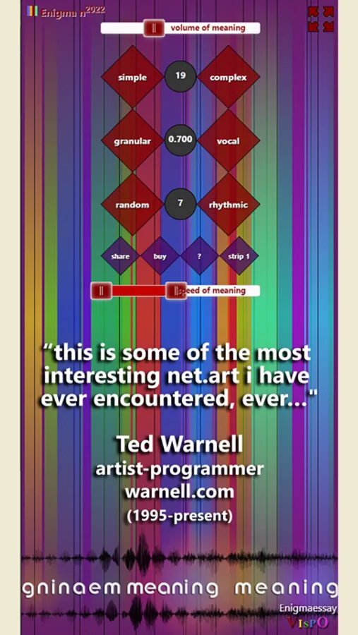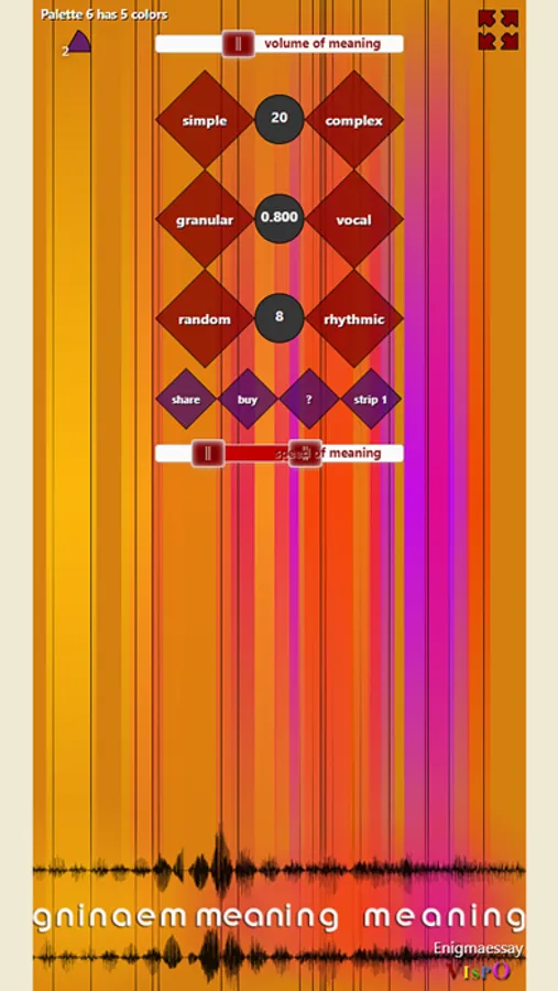 It's audio-centered but also visual music, color music. Use the “simple”/“complex” pair of diamond buttons to increase/decrease the width of the stripes—each of which represents a currently-playing sliver of sound. The width of the stripe is the sample's duration. Slivers can range from 0.001 seconds to 5 seconds.