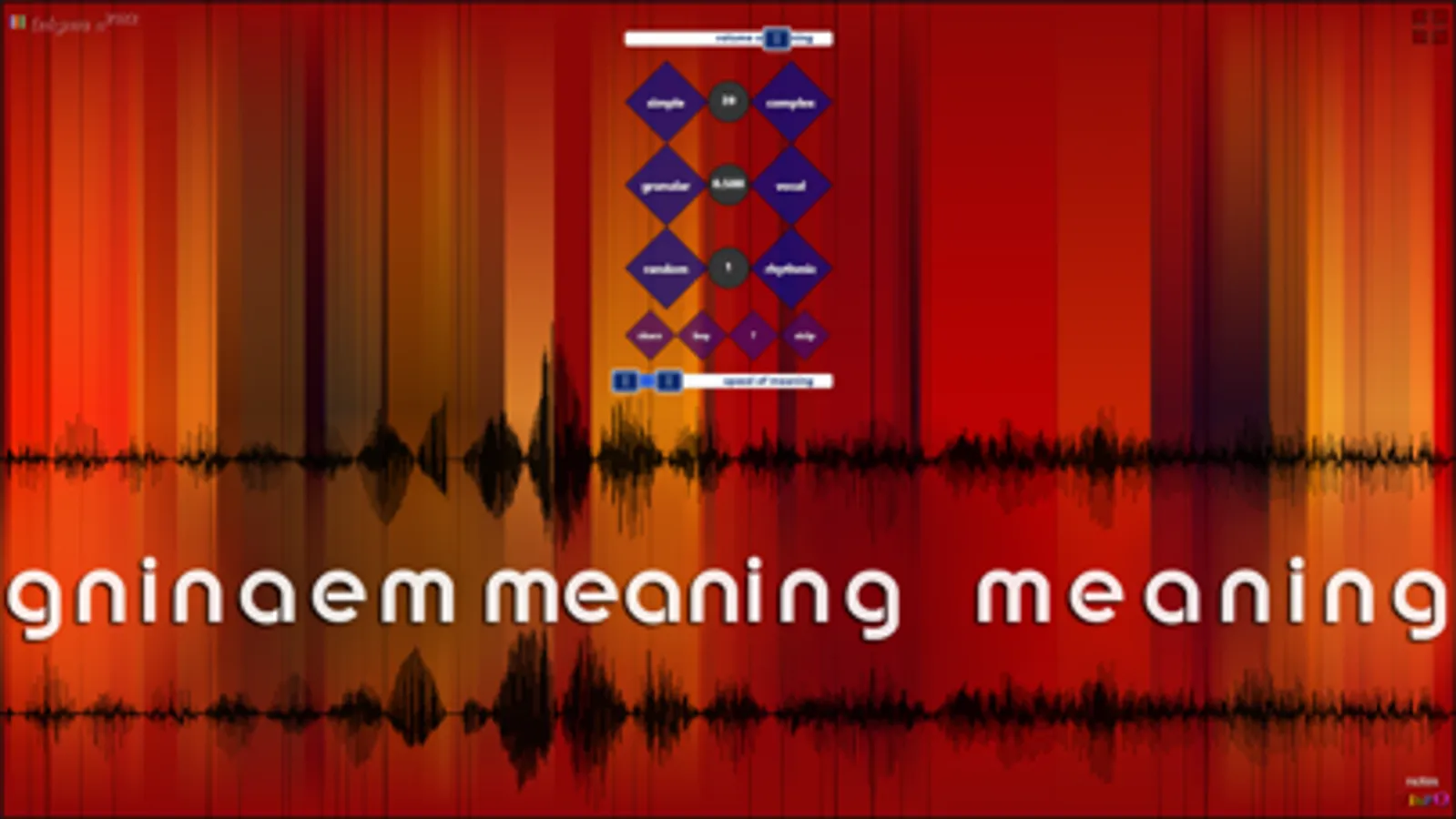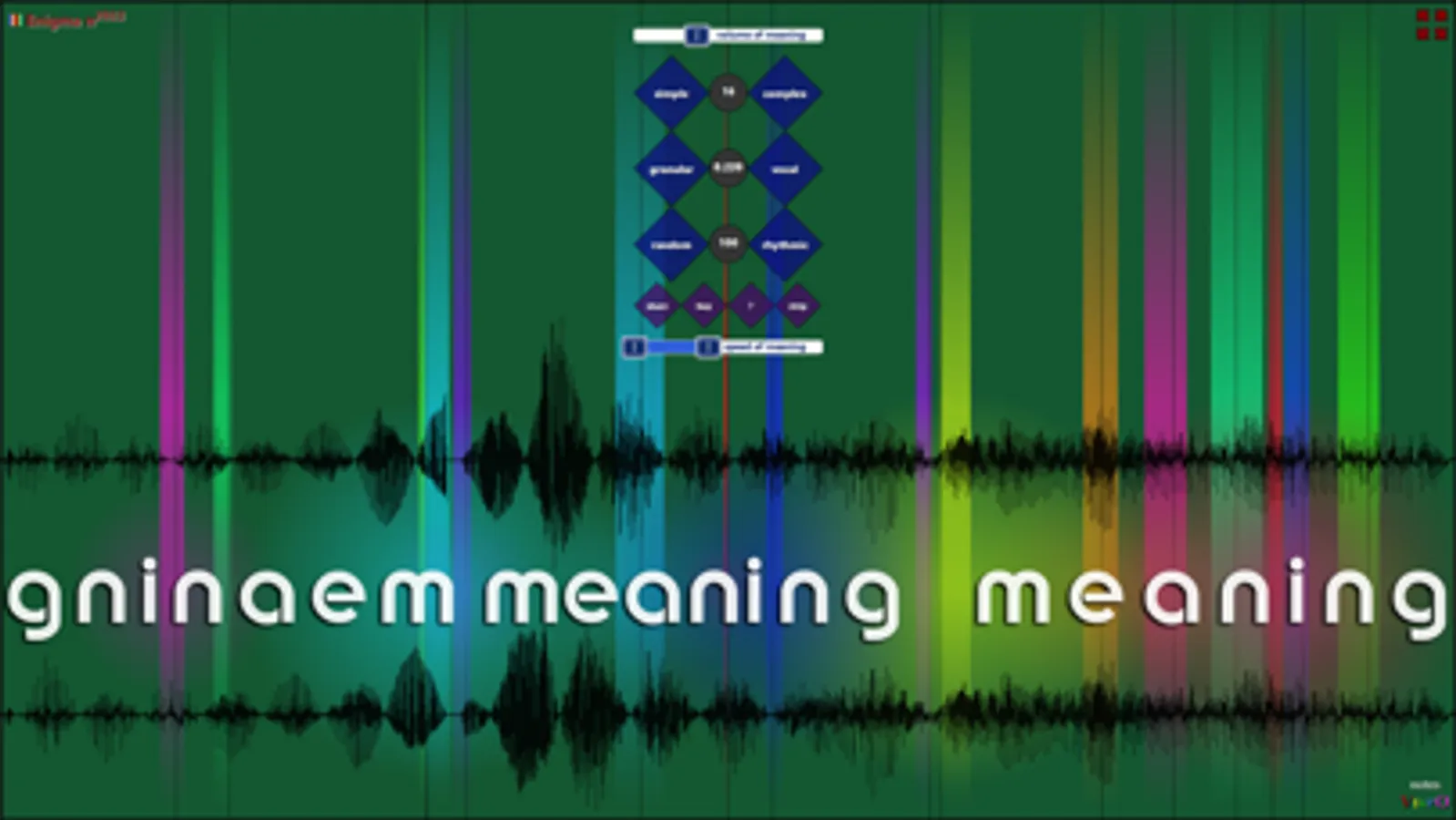 Set the speed of meaning slider, the audio pitch range, anywhere from 10 octaves down to 2 octaves up. You glimpse different worlds of meaning in the different levels of pitch—though the 5-second audio source sound is vocal—of the word 'meaning' intoned thrice,
