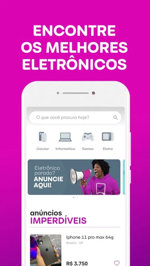 Um aplicativo exclusivo para compra e venda de produtos eletrônicos, novos e usados. Nosso marketplace é um ambiente prático e seguro para negociar seus produtos.