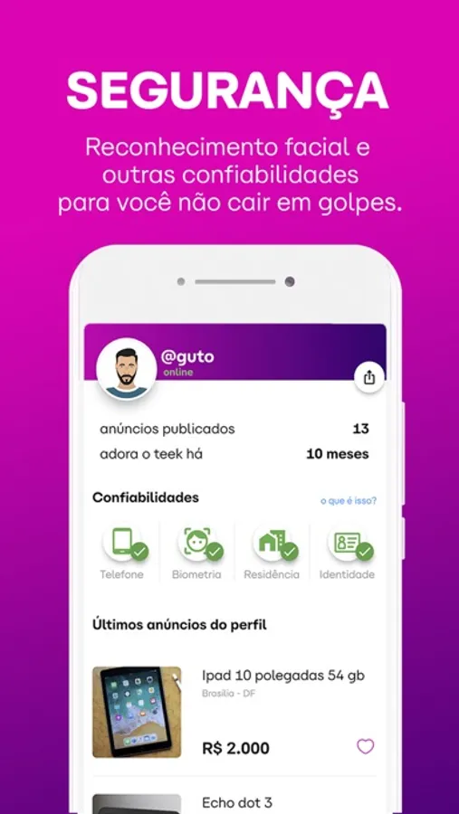Nosso sistema de confiabilidades conta com reconhecimento facial, validação de documentos, telefone, e-mail, entre outros. Para cada confiabilidade o usuário ganha um selo de confiança e você decide com quem quer fazer negócio.