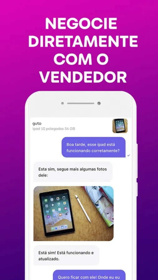 Baixe o aplicativo, anuncie seus produtos e aguarde as propostas. Você combina o valor, forma de pagamento e a entrega, sem intermediários e sem taxa.