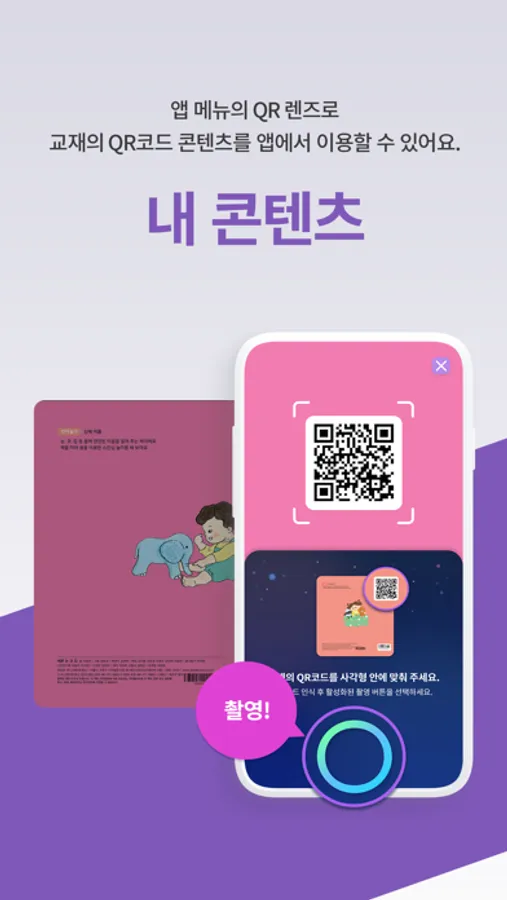 카메라: 교재의 QR코드를 스캔하여 동영상과 음원 콘텐츠 스트리밍을 위해 이 기능에 접근합니다.