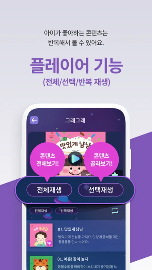 전체/ 선택/ 반복 재생의 기능으로 동영상과 음원 콘텐츠를 편리하게 즐길 수 있어요.
