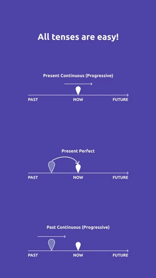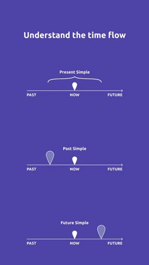We explain each tense with a simple, animated timeline, where you can see how the past, the present, and the future are related to the time.