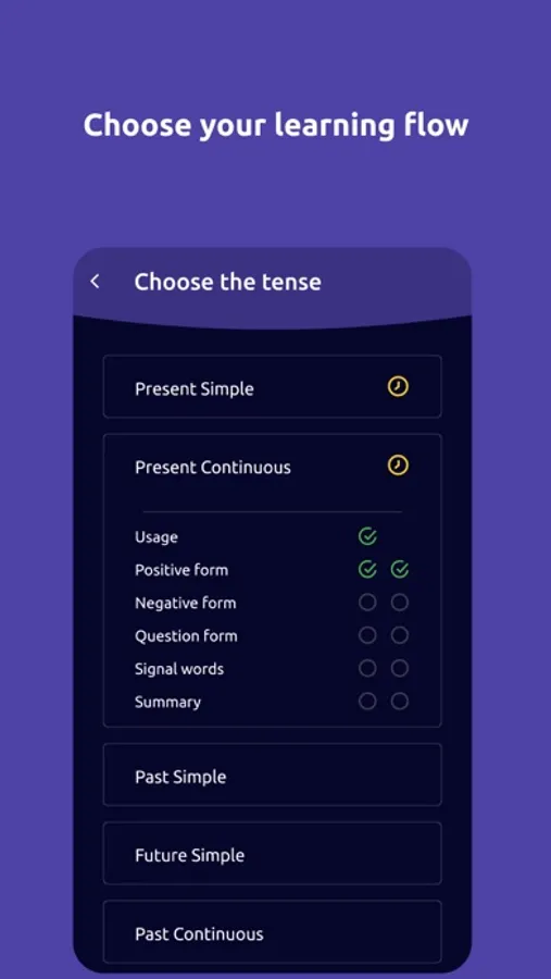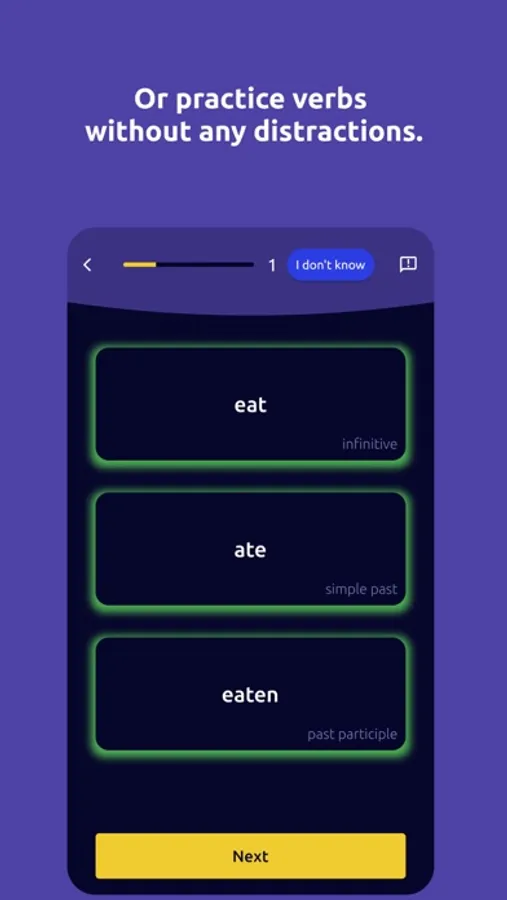 For the practice part, we used the reinforcement learning technique. It will help you memorize tenses and verbs quickly and for a longer time.
