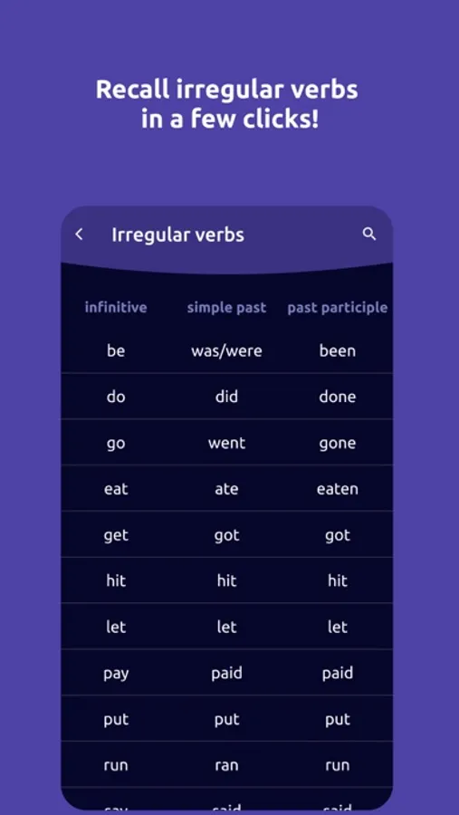 Last but not least, the app has a list of all irregular verbs represented on a single page with a search, so you will be able to rewind the verb on the fly.