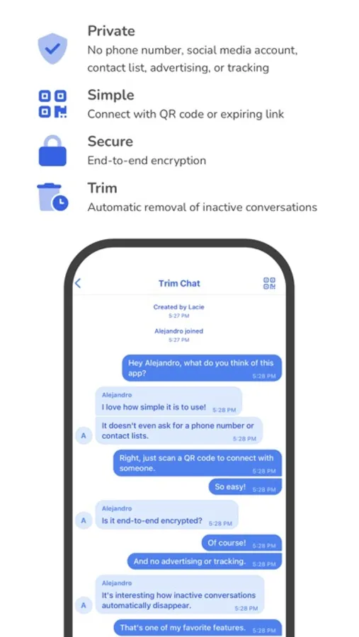 Trim Chat, the minimalist messaging app, is designed for short-lived exchanges, without the use of personal contact details like phone number, social media account, or contact list. As messages reach an age threshold, they are automatically deleted. If an inactive chat drops to zero messages, it too is deleted. Always trim, your list of chats contains only those most active and relevant.