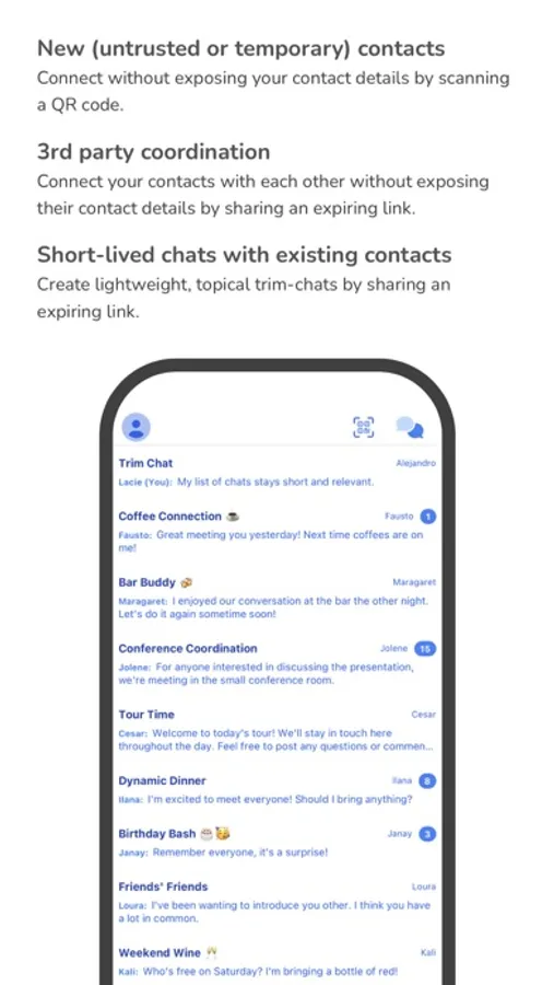 New (untrusted or temporary) contacts - connect without exposing your contact details by scanning a QR code