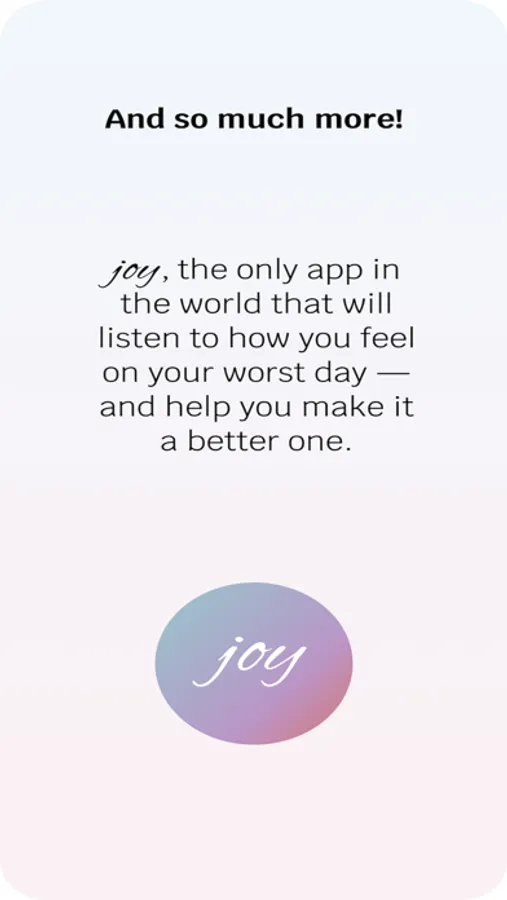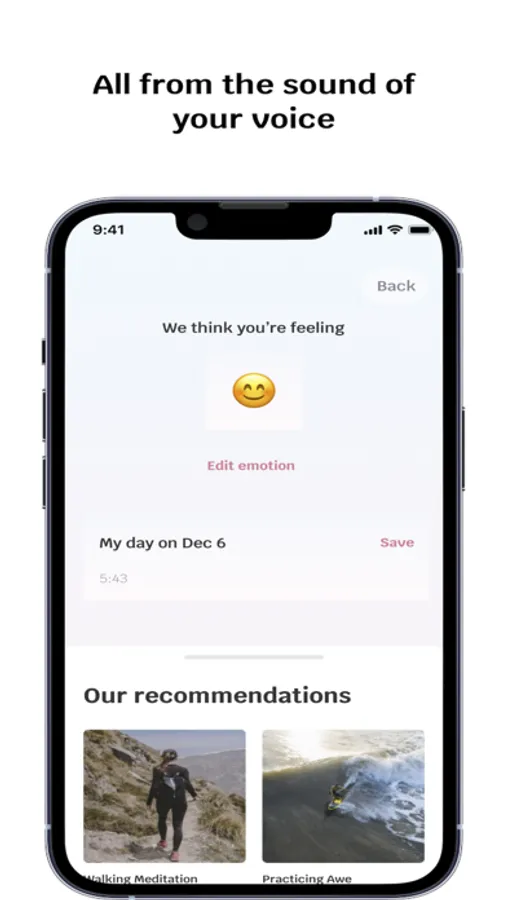 Using the latest advancements in AI technology, Joy can accurately recognize your emotions from the sound of your voice (in real-time) and deliver exclusive in-app wellness content from world-renowned experts that is keyed to your real-time emotional needs, with the push of just one button.