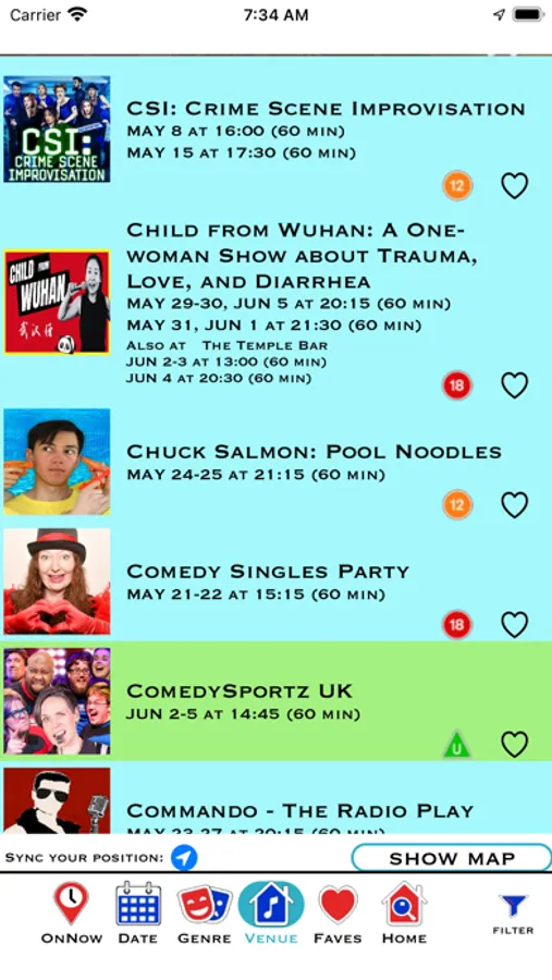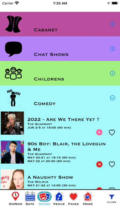 This includes Comedy, Theatre, Children’s Shows, Chat Shows, Music, Cabaret, Spoken Word, and Musicals.