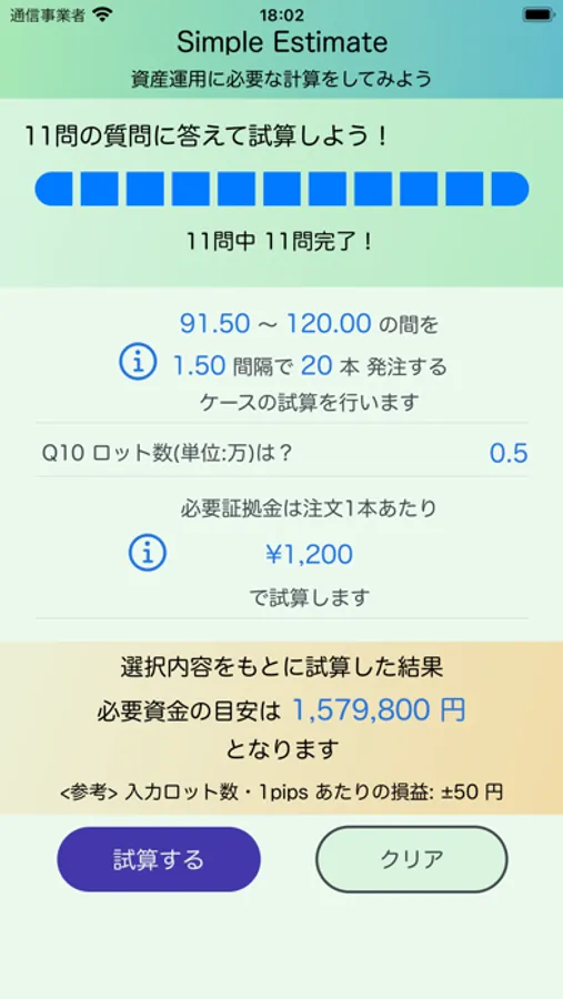 本アプリでは、ご自身の考えている注文内容に必要となる「資金」「損切レート」「ロット数」の目安となる試算結果を求めることができます。