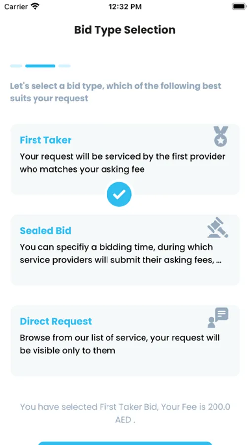 * Sealed bid: Service providers will begin bidding on your preferred pricing in an undisclosed manner, and the service provider with the lowest bidding price will be assigned to you.