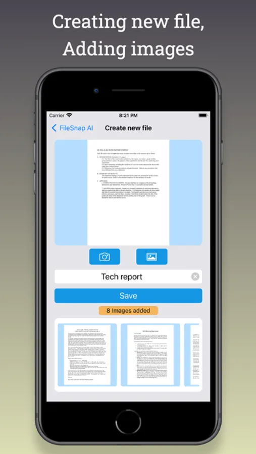 ‘FileSnap AI’ app is not a typical image gallery app to store all the images. It is built with Artificial Intelligence (Machine Learning) technology which filters the images captured through Camera (or) added through Photo gallery and allowed to save only the acceptable images of documents, reports, invoices, bills, handwritten notes, application forms, book pages etc. remaining other images will be rejected automatically and cannot be saved into the app.