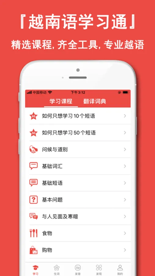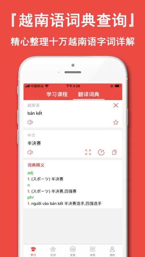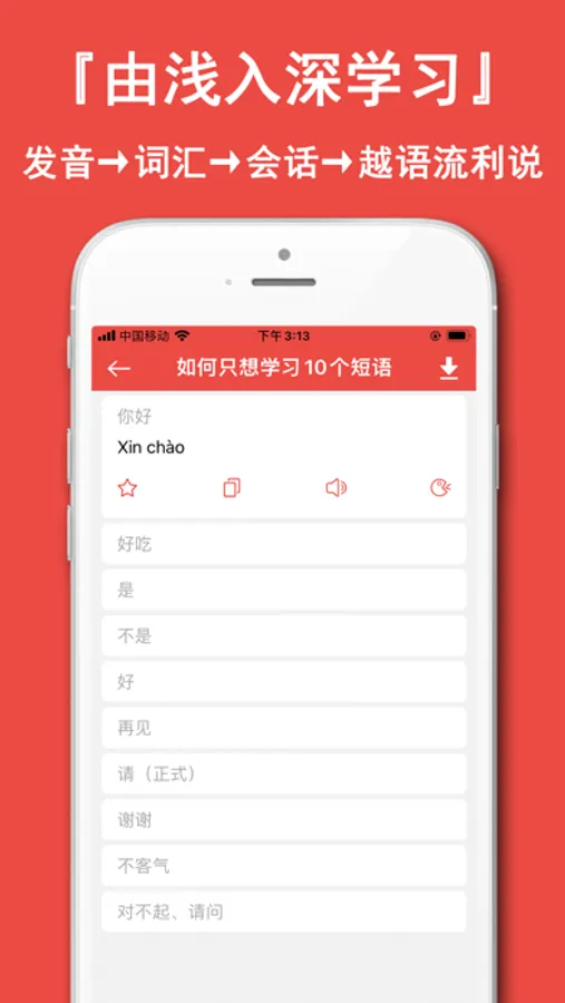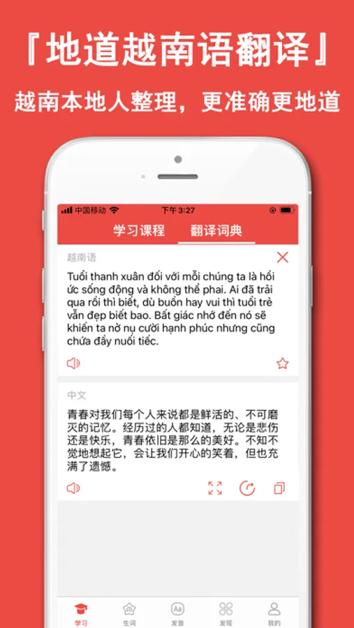 《越南语学习通》一款专注越南语学习利器,这里有全套的越南语学习资料、越南语翻译、越南语词典工具、越南语有声节目等。从越南语发音、词汇、短语、句子循序渐进,由浅入深快速学说越南语。还有越南语翻译词典,实在是旅行出行越南语学习随身必备App。