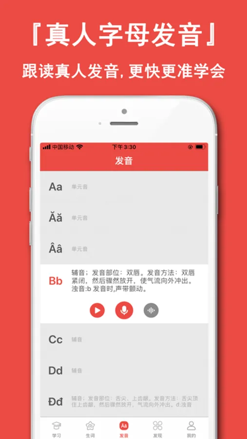 真人发音:标准真人字母发音,元音、辅音真人发声跟读学。