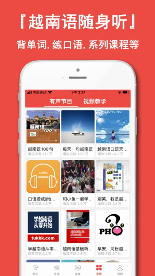 有声节目:整合越南语发音、口语、歌曲、有声课程、旅游等节目等你来听。