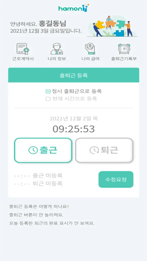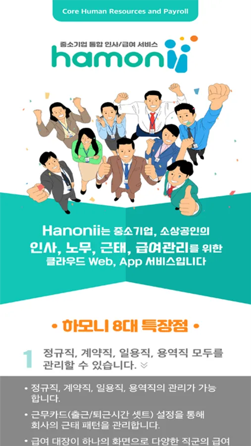 하모니는 중소기업, 소상공인의 인사, 근태, 급여 관리 서비스입니다. 정규직, 계약직, 일용직의 구분에 따라 최적의 프로세스를 직관적 UI를 통해 제공합니다. 기업의 노무 이슈를 매우 쉽게 관리할 수 있습니다.