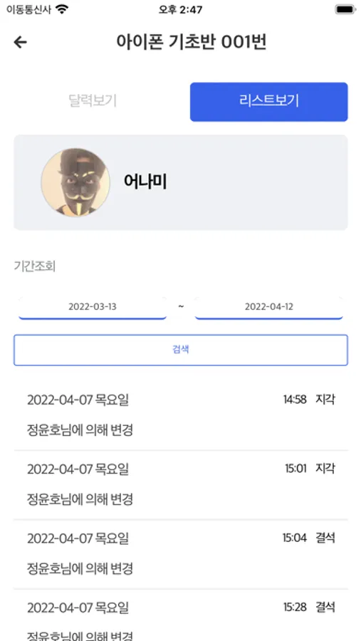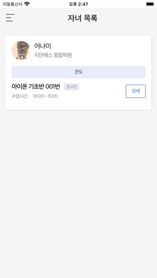 학부모님의 스마트폰에서 "출석했어요! 학원학부모용" 앱으로 간단하게 출석 기록을 확인할 수 있습니다.