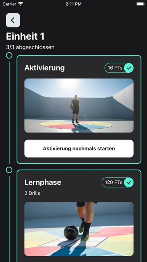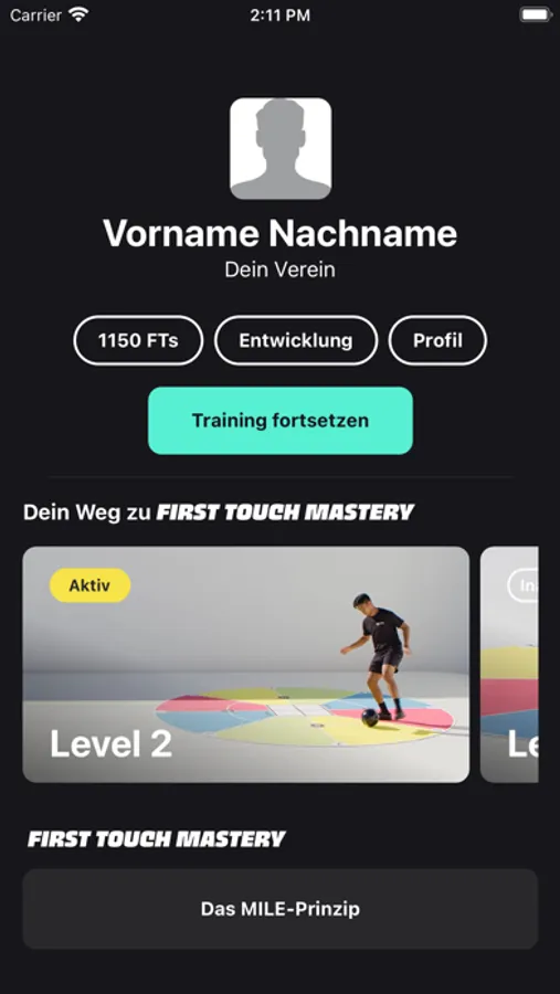 Der Mittelpunkt des Trainings spielt sich auf dem FT360-Circle ab. Die FT360-App in Verbindung mit dem FT360-Circle schafft ein Trainingskonzept, welches in dieser Art einzigartig auf dem Markt ist. Wir bieten dir mehr als 40 Trainingseinheiten über 10 Levels. Jede Trainingseinheit besteht aus 4 bis 5 Trainingsübungen auf dem FT360-Circle, sogenannten Drills. In jeder Trainingseinheit ist ein Aktivierungsdrill, Lerndrills und eine Challenge zu finden. Zusätzlich kannst du zwischen den Trainingseinheiten auch immer unsere FT360-Games spielen um bessere Lernerfolge zu erzielen. Schritt für Schritt gehst du deinen Weg zu First Touch Mastery.