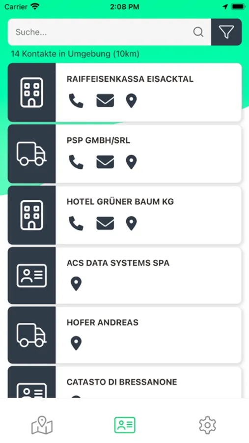 Nach dem Öffnen einer Adresse werden alle verfügbaren Kontaktinformationen angezeigt und können für Anrufe oder Versenden von Emails verwendet werden. Webseiten können aus dem Adresseintrag geöffnet werden. Die Adressen können auf der am mobilen Gerät verfügbaren Landkarte angezeigt werden.