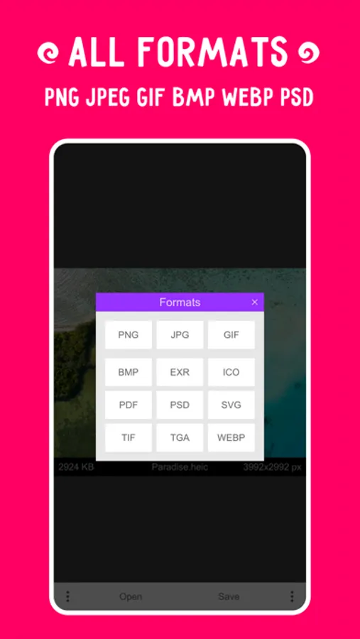 All Image Converter supports all popular image formats: PNG, JPEG, GIF, BMP, HEIC, HEIF, WEBP.